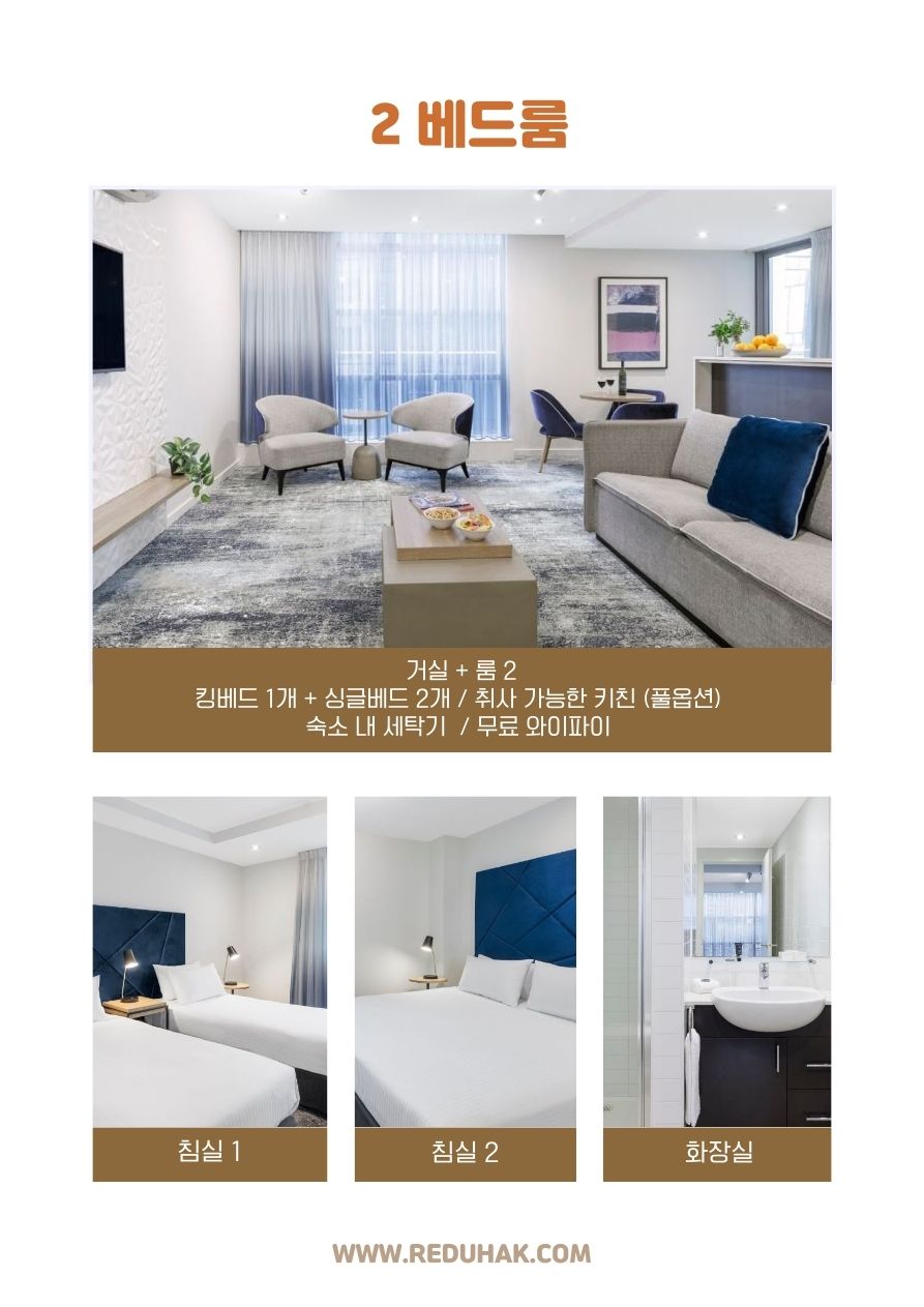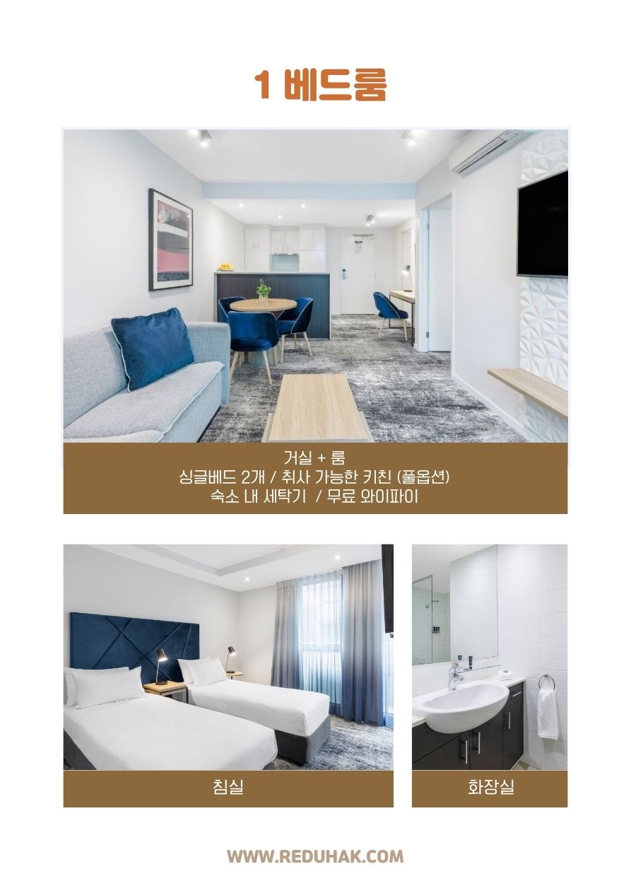 가족연수 기간동안 지내게 될 숙소는 멜번 CBD 내에 위치한 쾌적하고 깔끔한 아파트먼트로