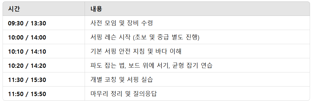 서핑 클래스 샘플 시간표
